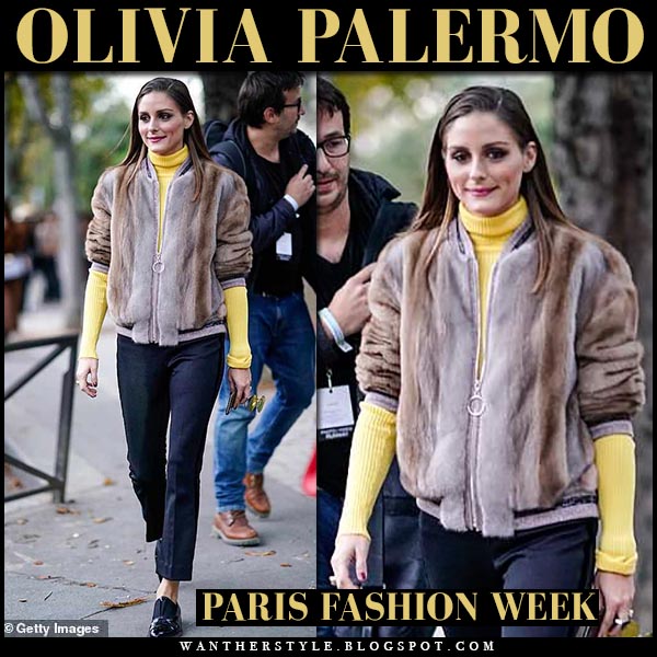 WHAT SHE WORE: Olivia wore brown for bomber jacket from Cara Mila, yellow turtleneck sweater, black cropped pants and black patent loafers from Givenchy